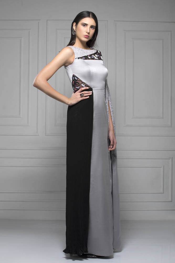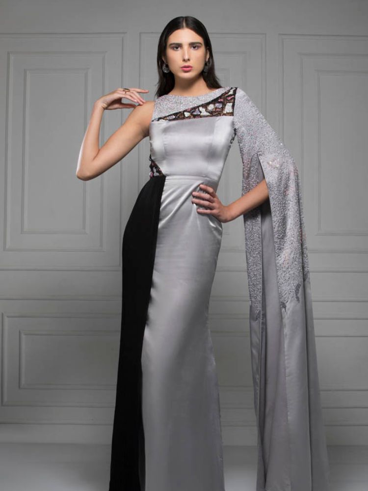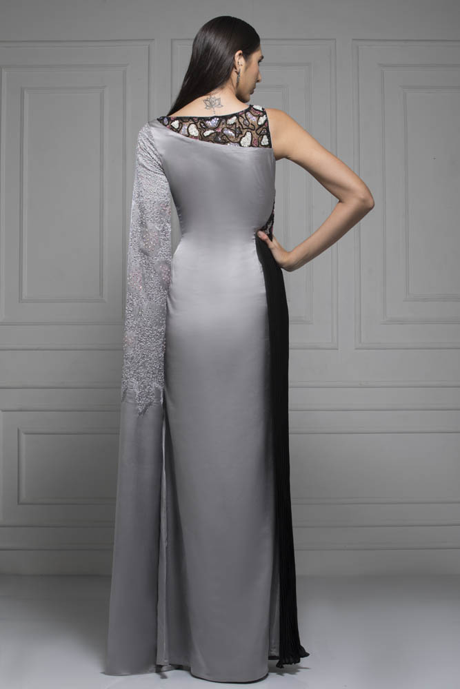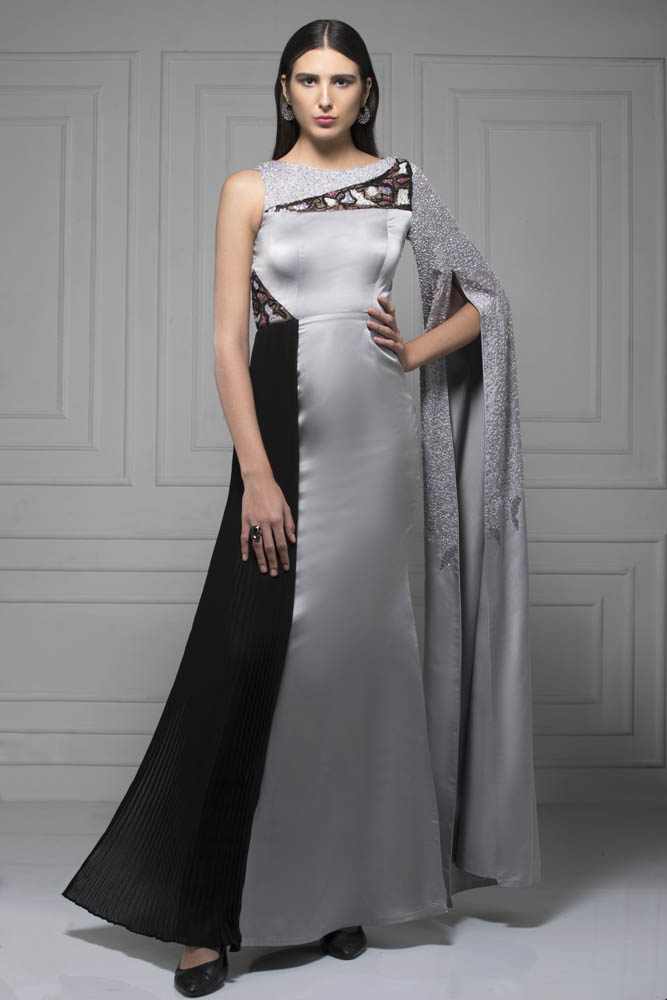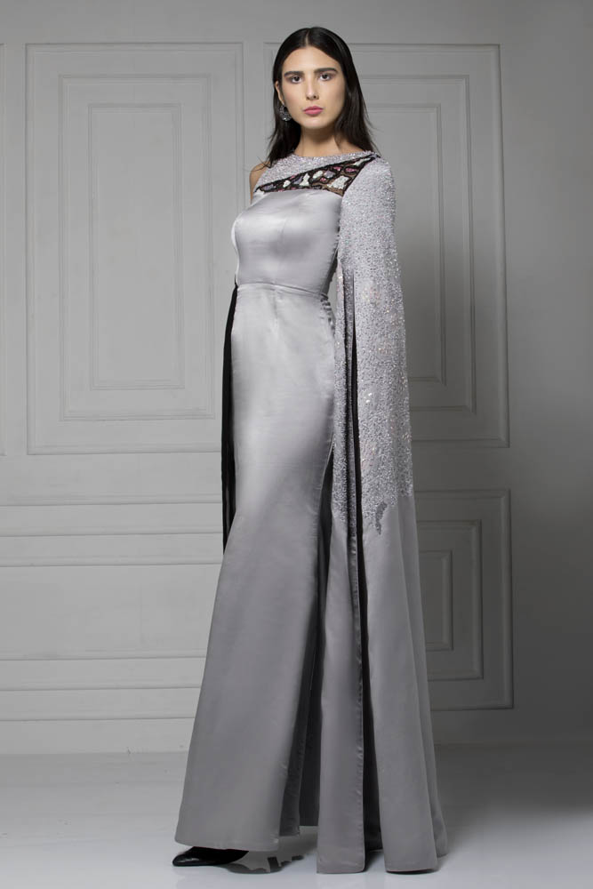 A stunning evening gown with intricate embroidery on yoke,sleeve and back. The side pleated panel is heat-set for a finer stay with the cape sleeve all-over embroidered. Tailored with precision and great craftsmanship for an exquisite ensemble. Style it for your next event to make heads turn.