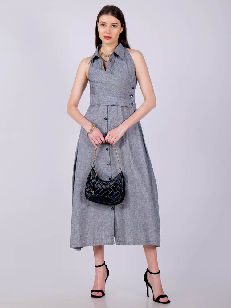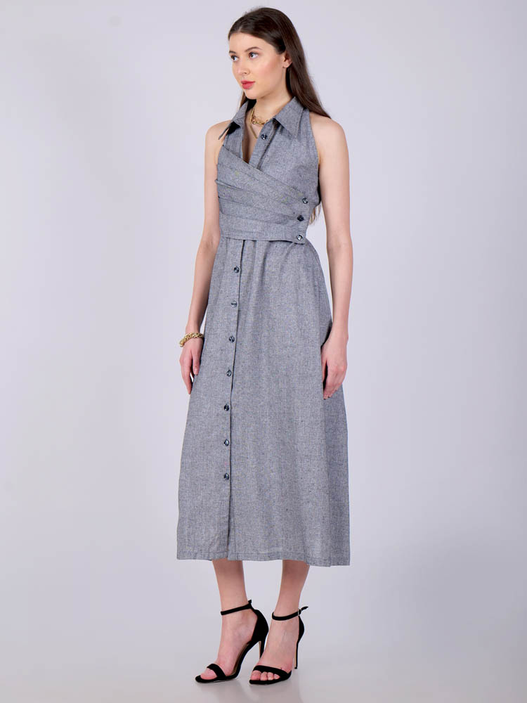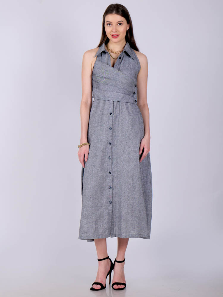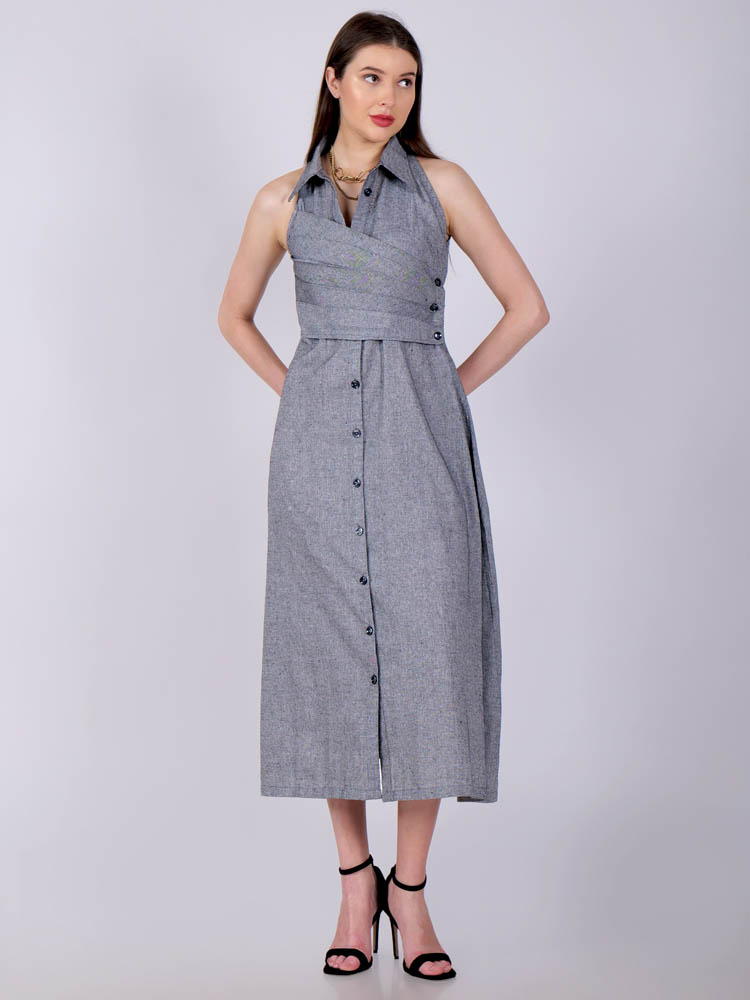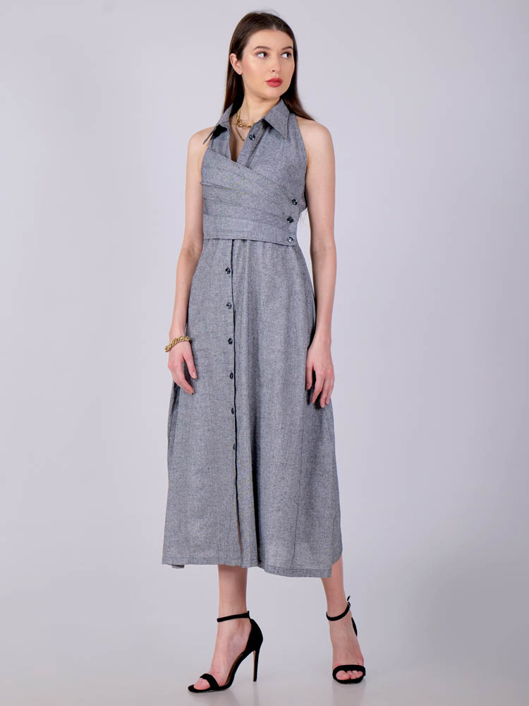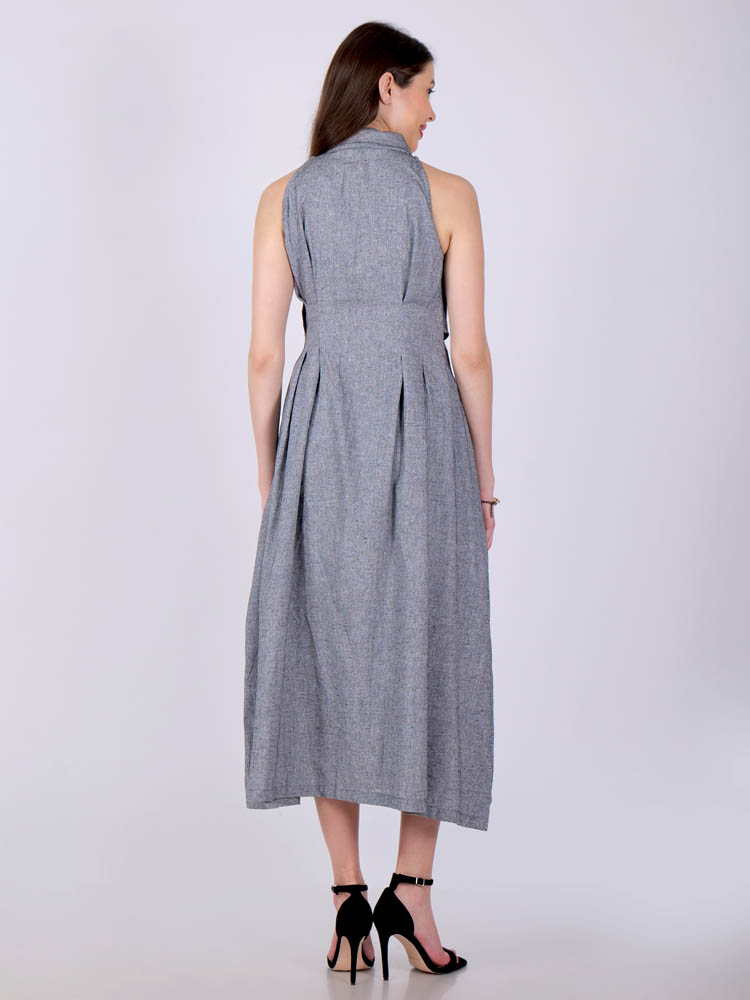 This ethereal dress in a perfect gray encapsulated with pleat detailing in front and features darts in the back for a slimmer look. A collared neckline in halter cut exude elegance and uber-chic Tailored with lightweight and breathable cotton khadi fabric for utmost comfort. Style it for a vacation or wear it as a casual outfit.